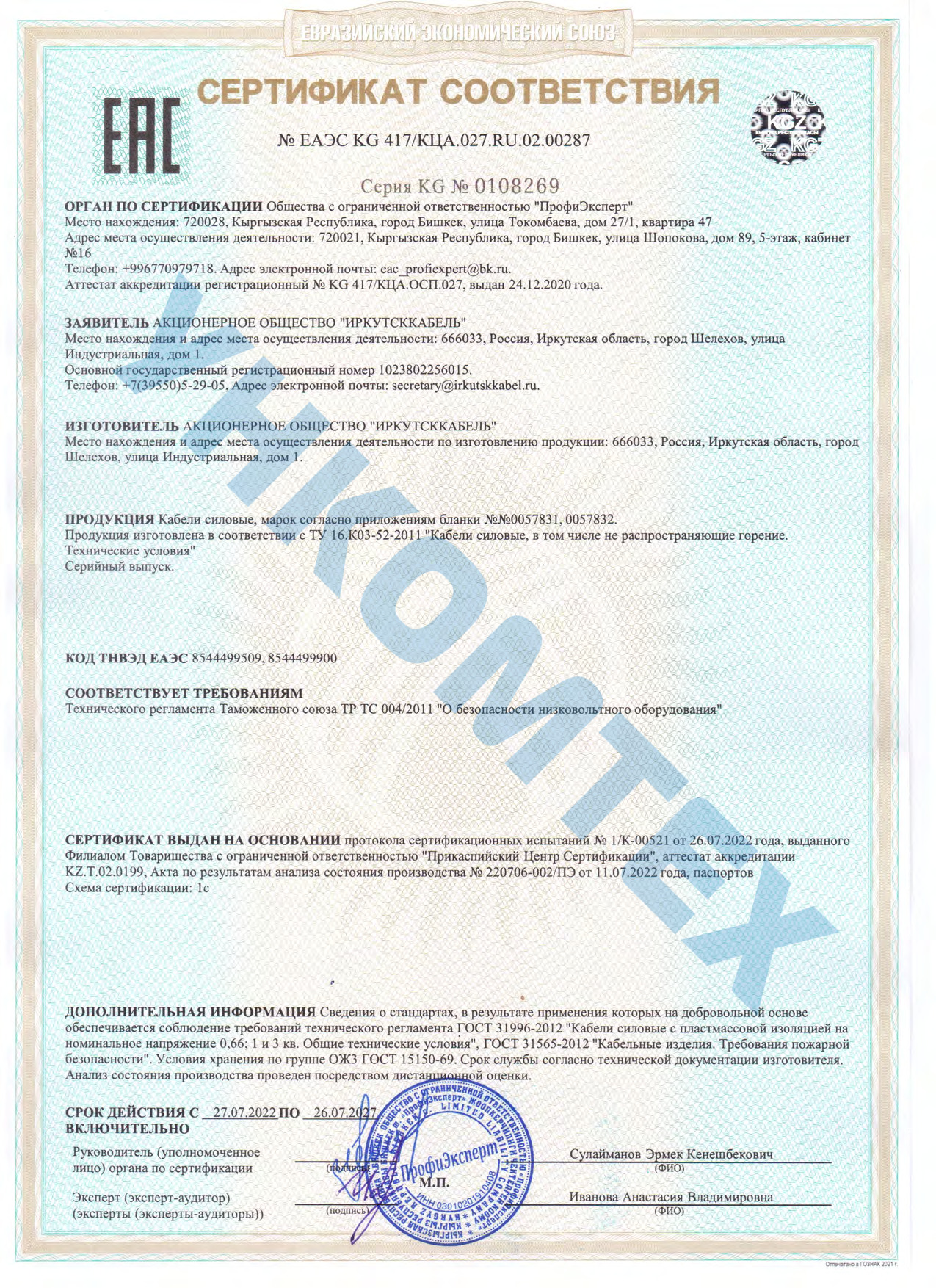 Применение: Для эксплуатации в электрических сетях переменного напряжения с заземлённой или изолированной нейтралью, в которых продолжительность работы в режиме однофазного короткого замыкания на землю не превышает 8 ч, а общая продолжительность работы в режиме однофазного короткого замыкания на землю не превышает 125 ч за год. Для прокладки без ограничения разности уровней по трассе прокладки, в том числе и на вертикальных участках. Для групповой прокладки кабельных линий в кабельных сооружениях и помещениях внутренних (закрытых) электроустановок. Для электропроводок в жилых и общественных зданиях. Кабели изготавливаются для общепромышленного применения при поставках на внутренний рынок и на экспорт.