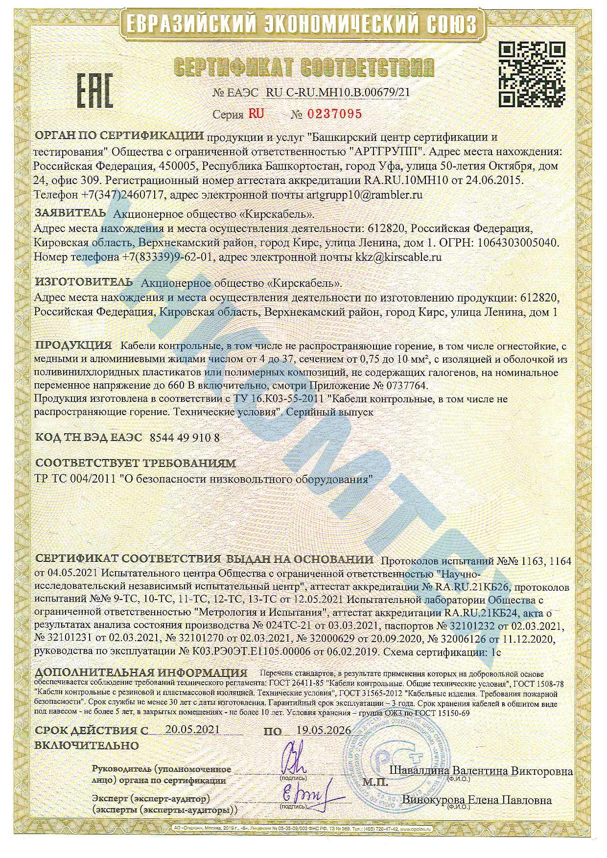 Кабель контрольный огнестойкий, с изоляцией и оболочкой из полимерных композиций, не содержащих галогенов, не распространяющий горение при групповой прокладке и не выделяющий коррозионно-активныx газообразныx продуктов при горении и тлении, в общем экране