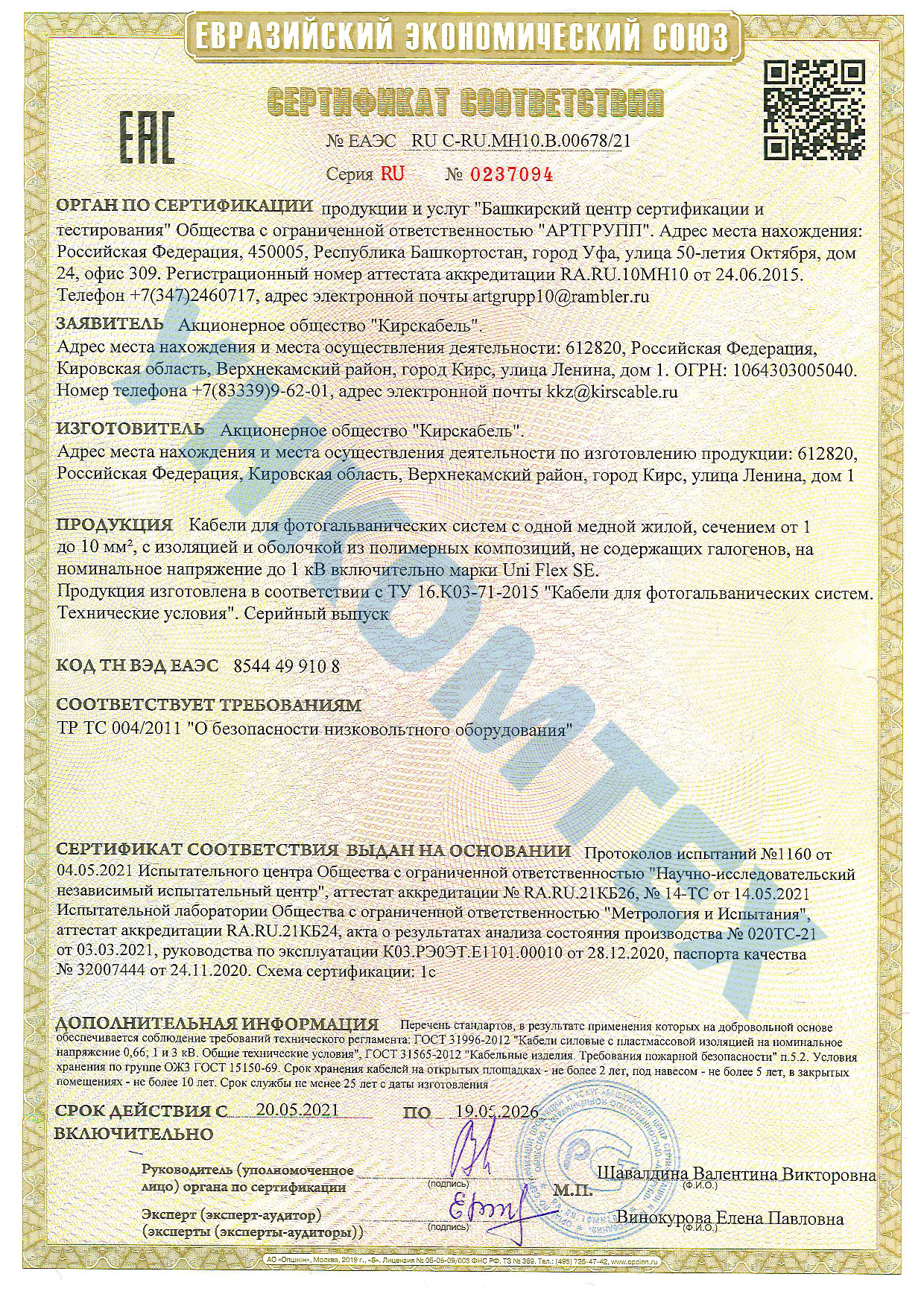 Применение: Кабели предназначены для постоянного соединения компонентов фотоэлектрических систем низковольтных устройств напряжением до 1000 В включительно внутри и вне помещений в условиях воздействия окружающей среды до 90 °С при максимальной температуре проводника до 120 °С.