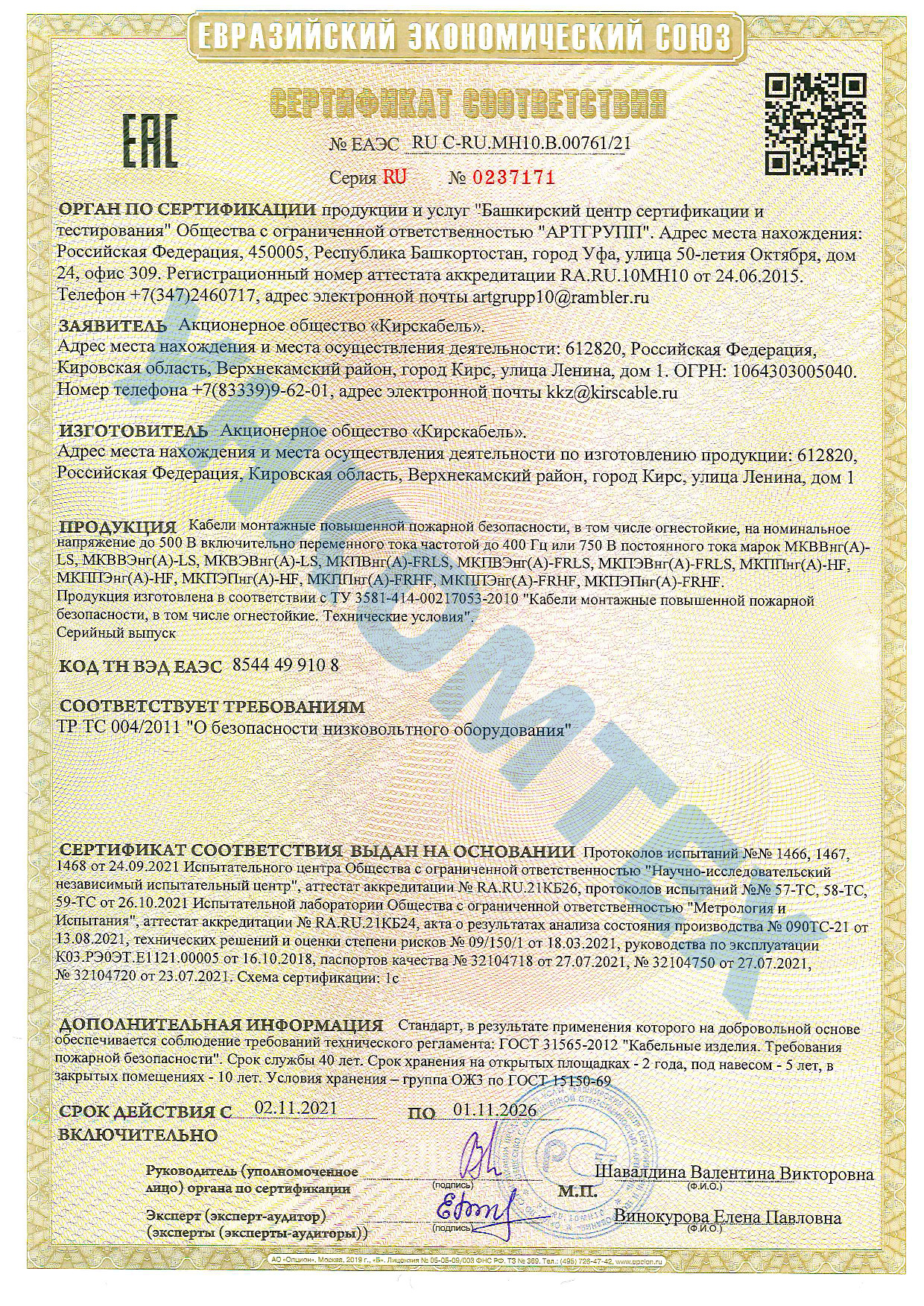 Кабель монтажный огнестойкий, с изоляцией из полимерной композиции, не содержащей галогенов, и оболочкой из поливинилхлоридного пластиката пониженной пожарной опасности, не распространяющий горение при групповой прокладке, с низким дымо- и газовыделением, в общем экране в виде оплетки из медных луженых проволок