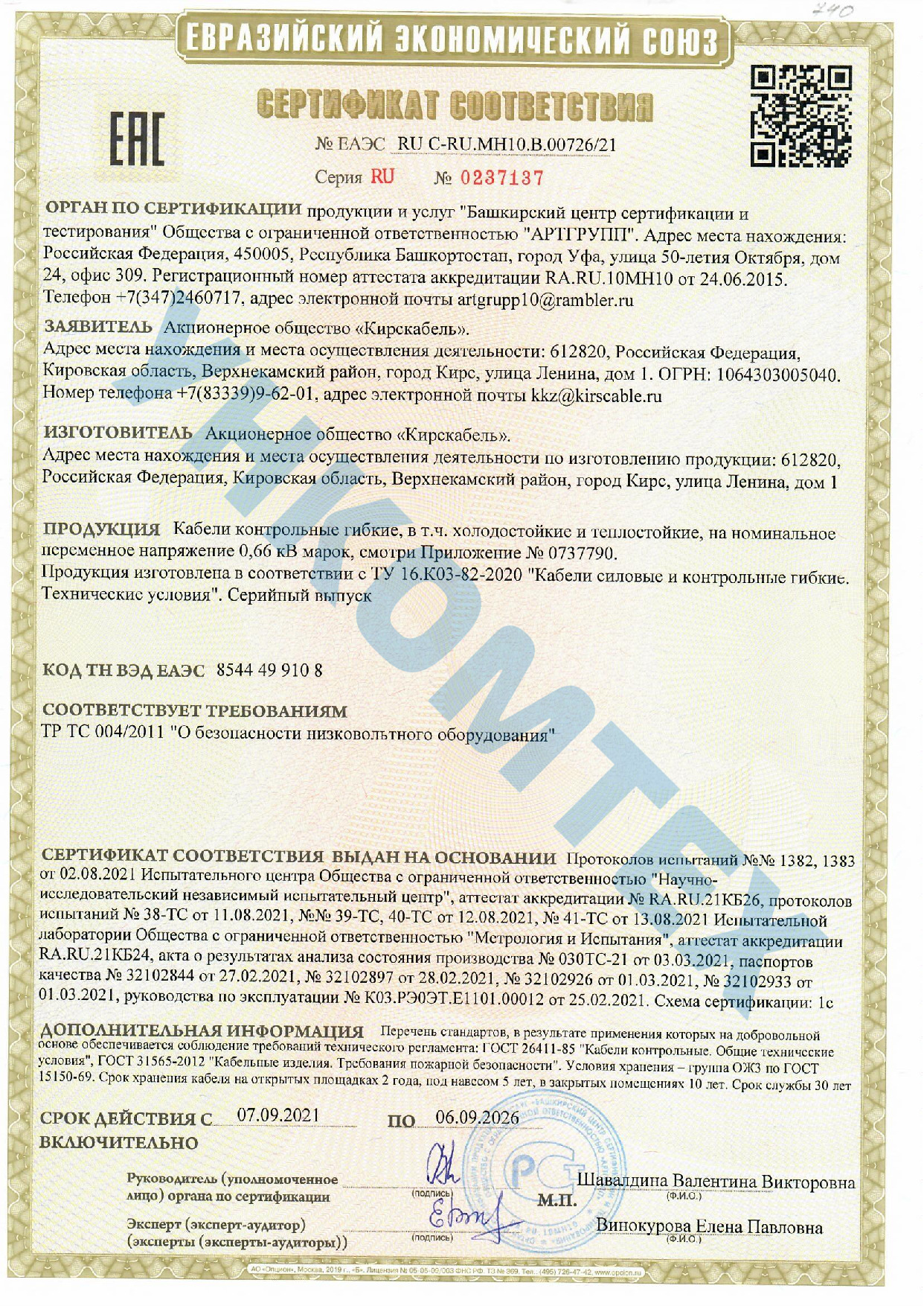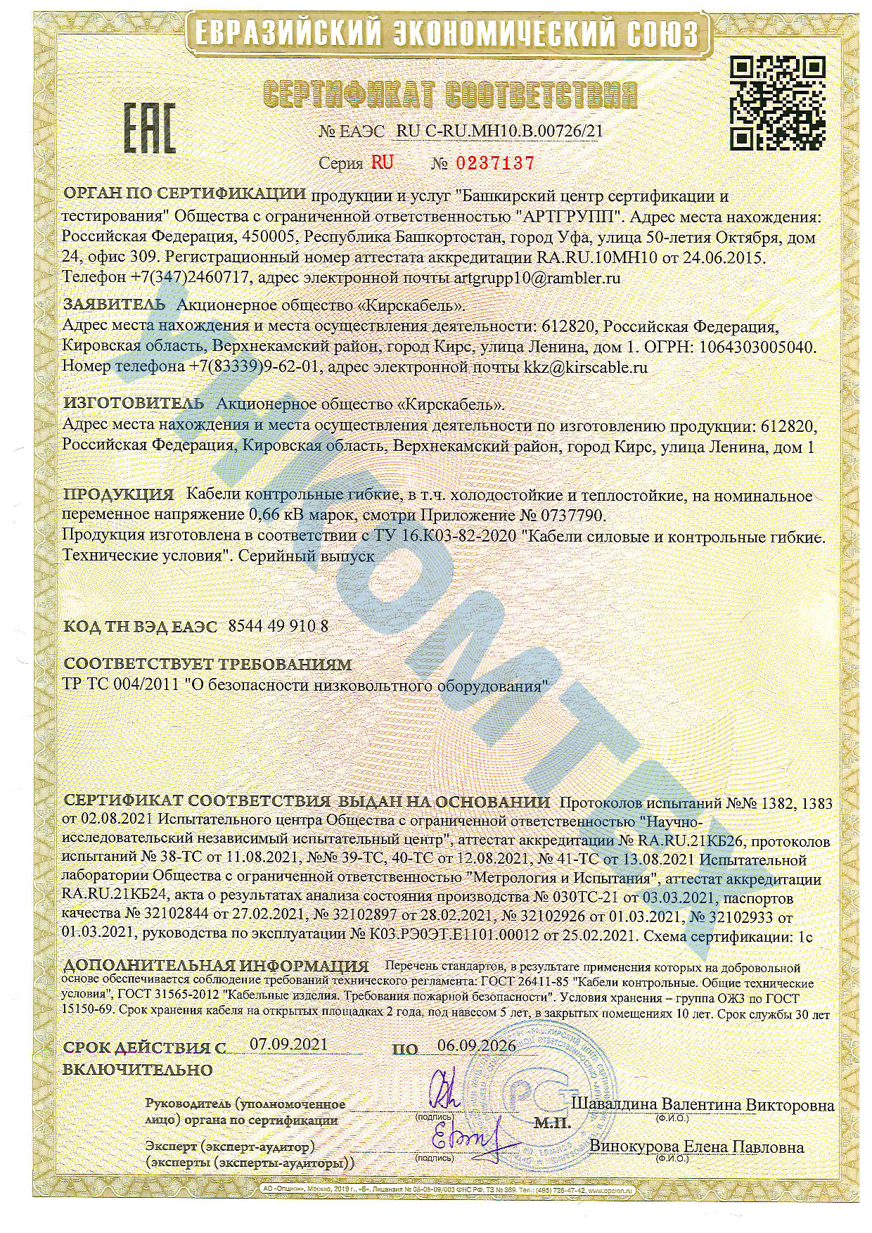 Кабель повышенной гибкий, контрольный, с медными жилами, с изоляцией и оболочкой из поливинилхлоридного пластиката пониженной пожарной опасности, не распространяющий горение, с низким дымо- и газовыделением, в общем экране в виде оплетки из медных проволок
